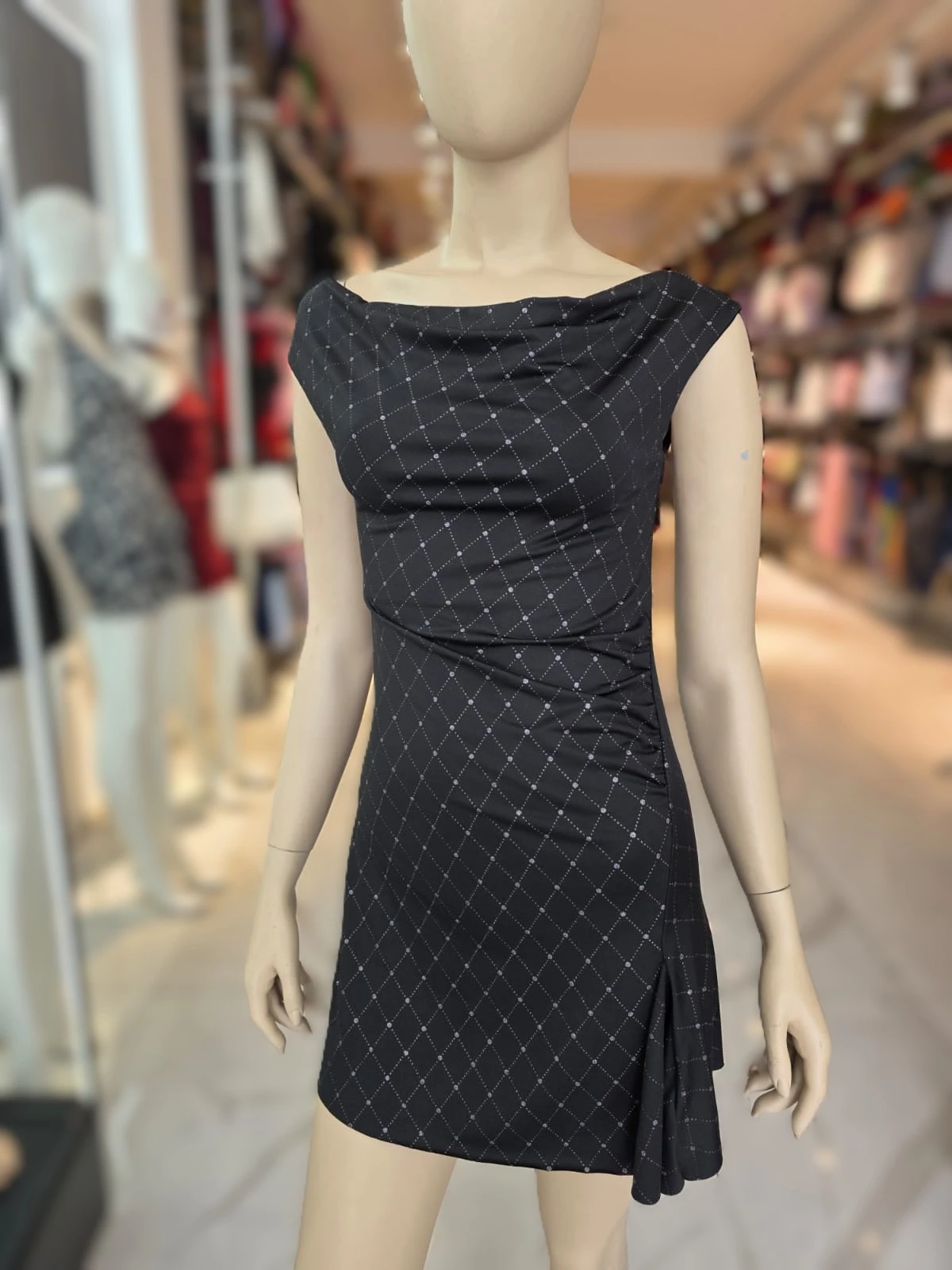 Vestido con brillantina en forma de rombo, escote bote